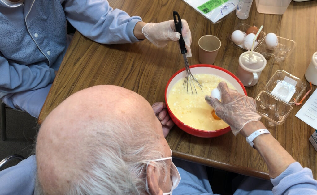 男性患者さまが片手で卵割りに成功すると歓声が上がるなど、終始笑顔の絶えない和やかな時間となりました。